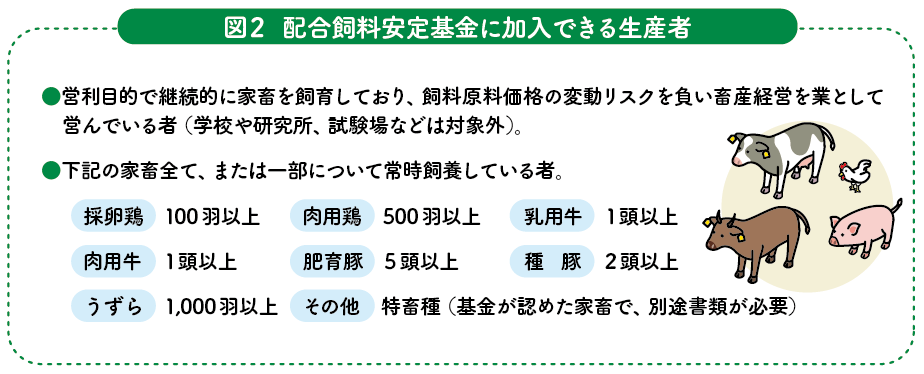 配合飼料安定基金は4年を一つの事業単位としているため、「基本契約」を4年ごとに締結します。そのうえで、積立や補てんの根拠となる契約数量を四半期別に結ぶ「数量契約」を毎年締結します。配合飼料安定基金に加入できる生産者は図2の通りです。