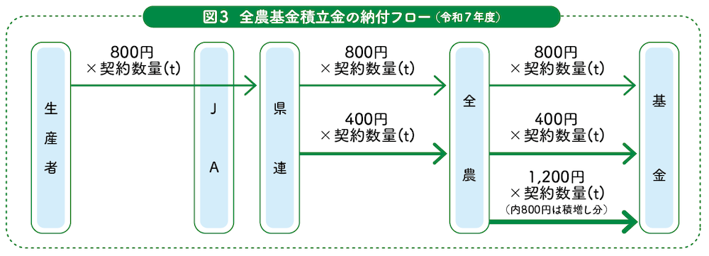 4月、6月、9月、12月が積立金の納付時期になります。全農基金の令和7年度の積立金単価は、1t当たり生産者が800円、県連が400円、全農が1200円(そのうち800円は積増し分)です(図3)。単価は毎年見直されますので詳細はお近くのJA職員にご確認ください。