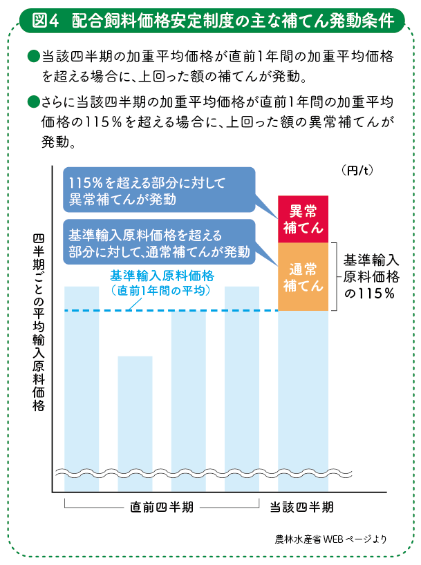 「補てん単価」は輸入5原料(トウモロコシ・マイロ・大豆粕・大麦・小麦)の当該四半期の加重平均価格と直前1年間の加重平均価格を比べて、当該四半期の加重平均価格の方が高ければ、その差が補てん単価の上限となります。補てん単価は50円単位で切り捨てとなり、単価が500円未満の場合は補てんを行いません。また、補てんは「通常基金」からの「通常補てん」が優先して交付されますが、当該四半期の加重平均価格が直前1年間の加重平均価格と比べて115%を超えた場合、その部分は「異常基金」からの「異常補てん」が交付されます(図4)。「補てん対象数量」は、当該四半期に出荷された数量と契約数量を比べて少ない方が対象となります。