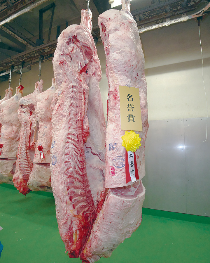 名誉賞を受賞した町井一貴さんの出品牛は、父が「福之姫」、母の父が「安福久」、母の祖父が「百合茂」。肥育期間31カ月で、枝肉重量556kg。格付A5、ロース芯面積112㎠、歩留基準値81・3、脂肪交雑(BMSナンバー)12、バラ肉の厚さ9・5cm、皮下脂肪の厚さは2・2cmだった。講評では「ロース芯の脂肪交雑はバラ寄りに粗いさしがあったが、僧帽筋、広背筋ともに小ざしで充実しており、厚みにも迫力があった。遠目から見ても、枝肉の姿が素晴らしかった」と高い評価を受けた。
