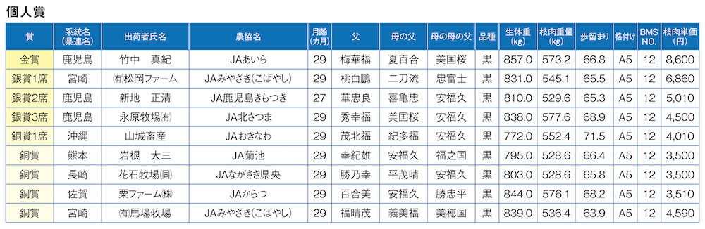 団体部門で最高位の優秀賞は2年連続でJA鹿児島県経済連が獲得した。格付等級、BMSナンバーの平均値で優秀賞を決めるが、今年は鹿児島県と宮崎県が同点となった。そのため共励会ルールに基づき、個人賞の入賞が多かった鹿児島県勢に決まった。