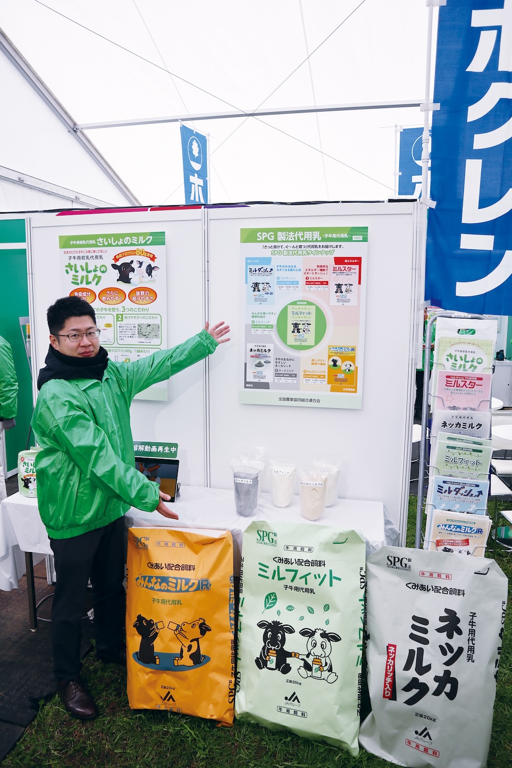 JA全農は、特設ブースで代用乳のライナップを紹介しました。JA全農の代用乳はSPG(Spray Dry & Granulation)製法を用いて製造しており、固結しにくく溶解性も高くなっています。さまざまな特徴を持つ代用乳を5種類取りそろえているので、お客様のお好みによって使い分けることが可能です。